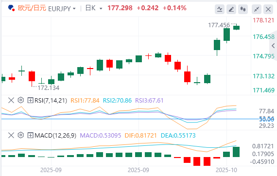 欧元/日元交叉盘可能瞄准10月8日创下的历史新高176.46。进一步上涨将支持货币交叉盘探索177.00心理水平附近的区域。