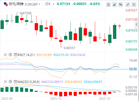 欧元/英镑交叉盘上涨,欧元(EUR)在欧盟委员会报告初步消费者信心指数后获得支撑,该指数在10月份升至-14.2,为8个月来的最高水平,高于9月份的-14.9,超过市场预期的-15。消费者对欧元区经济活动的信心增强表明,近几个月来欧洲央行(ECB)借贷成本下降和通胀缓解提供了支撑。