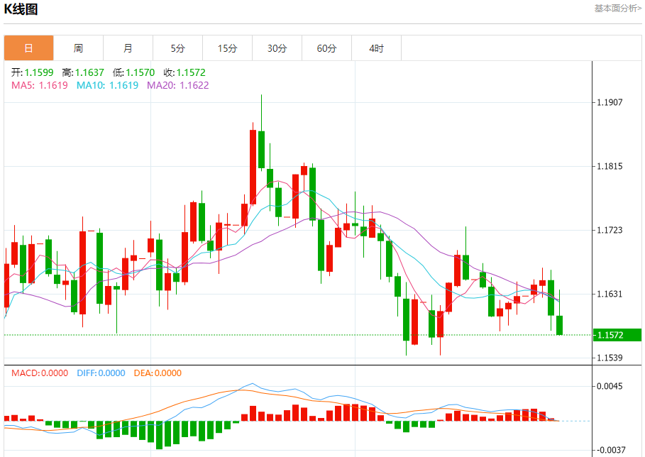 周四盘中,欧元/美元报1.1572,跌幅0.25%。