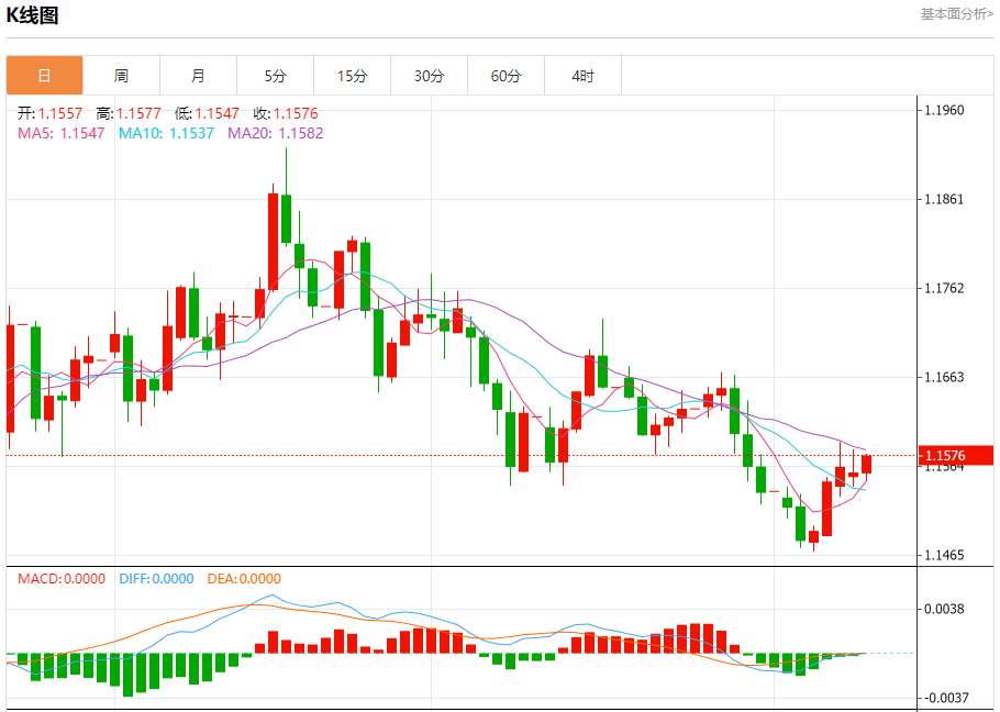 周二盘中,欧元/美元报1.1576,涨幅0.16%。