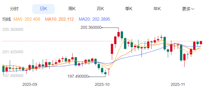 周三,英镑/日元上涨0.23%至203.20附近。