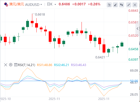 澳储银行11月会议纪要显示,央行可能会在较长时间内维持利率不变。ASX30天银行间现金利率期货显示,截至11月25日,2025年12月合约交易为96.41,这意味着在即将召开的澳大利亚储备银行董事会会议上,利率从3.60%降至3.35%的概率为6%。