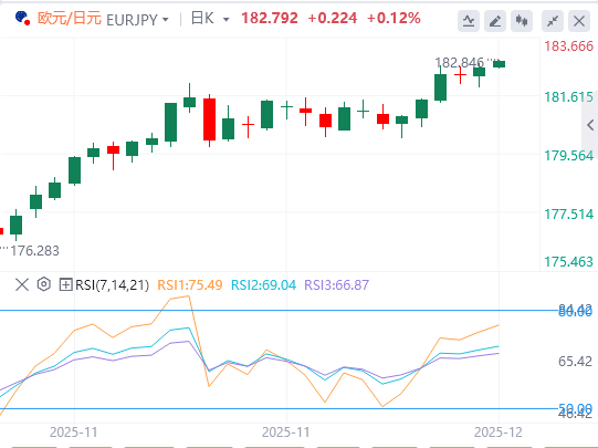 日线图中,欧元/日元报182.75。该指数远高于上升的100日均线175.89,保持了整体上涨趋势。平均值的正斜率支持延续,即使距离均值增加。RSI在68.85接近超买,显示出强劲动能,若价格盘整,动能可能会有所缓和。