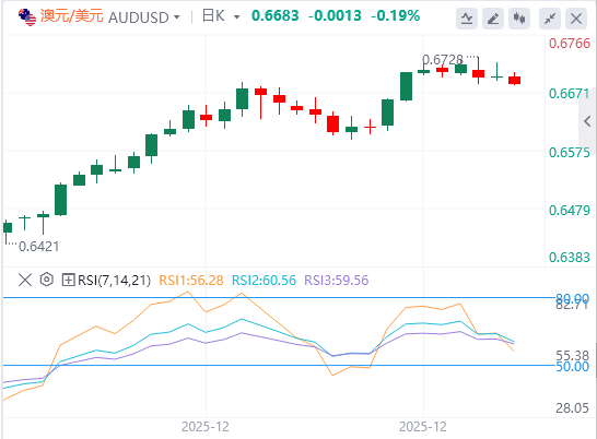 当货币对维持收盘于上升平均线上方时,偏向仍会持续上升,跌幅可视为上涨中的修正。若日收盘价高于12月29日高点0.6725,将打开通往整数水平0.6800的大门。