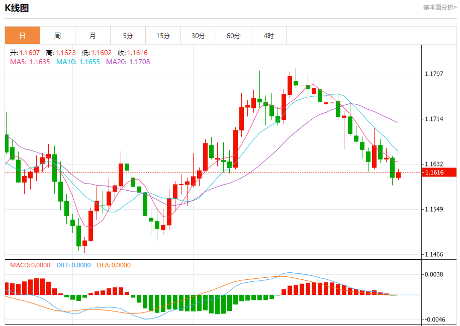 周五盘中,欧元/美元报1.1614,涨幅0.05%。