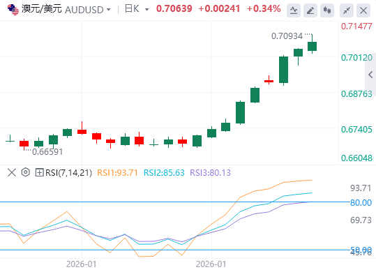 从更宏观的角度看,当前的发展认为,从0.5913(2024年低点)的上升正在逆转0.8006(2021年高点)的整体下跌趋势。进一步反弹至61.8%回撤,0.8006至0.5913,报0.7206。只要0.6706阻力转为支撑,即使经历深度回调,这一情况仍将被看好。