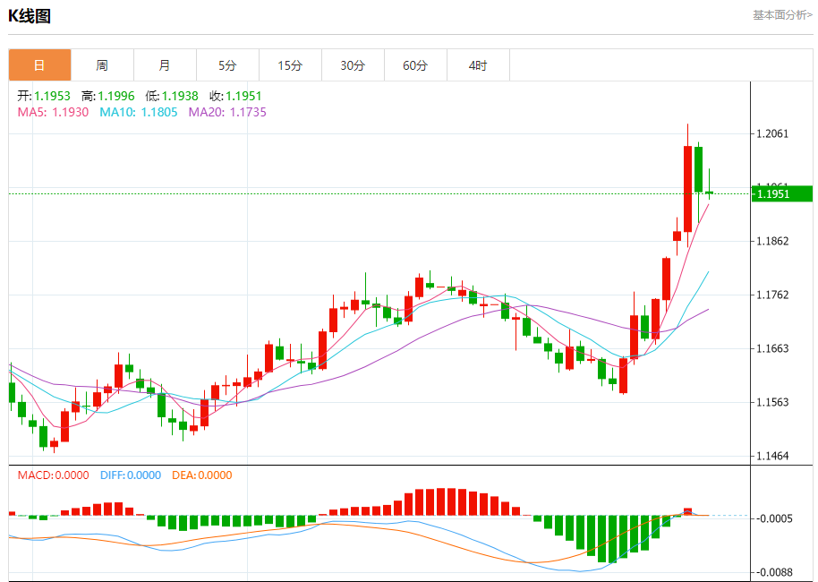 周四盘中,欧元/美元报1.1946,跌幅0.07%。