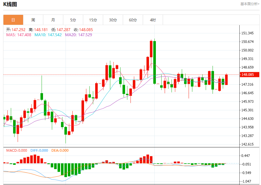 周三盘中,美元/日元报148.003,涨幅0.42%。 今日分析:在147.65之上,看涨,目标价位为148.45,然后为148.80。 技术点评:RI技术指标看涨,有进一步上升空间。 支撑位:147.65147.50147.30 阻力位:149.00148.80148.45 (亚汇网编辑:冰凡)