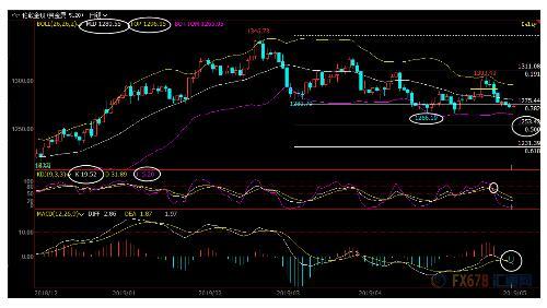 上方布林线中轨阻力在1280.56附近,在收复该位置前,后市依然偏向下行;若回升至该位置上方,则削弱短线看空信号;5月15日低点阻力在1292.87附近,布林线上轨阻力在1296.05附近。