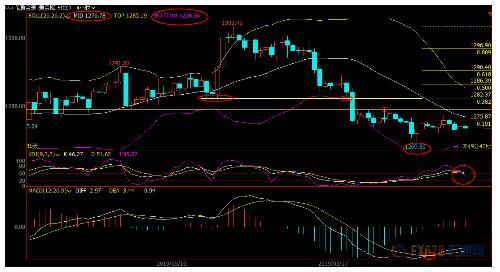 上方初步阻力在布林线中轨1276.78附近,短线跌势的38.2%回撤位阻力在1282.37附近,若意外收复该位置,则削弱短线看空信号。