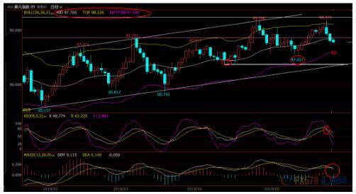 周线级别:震荡;MACD轻微顶背离KDJ高位出现死叉,汇价在布林线上轨附近受阻,短线偏向试探布林线中轨96.88附近支撑,如果失守该位置,则后市可能进一步跌向布林线下轨95.53附近。