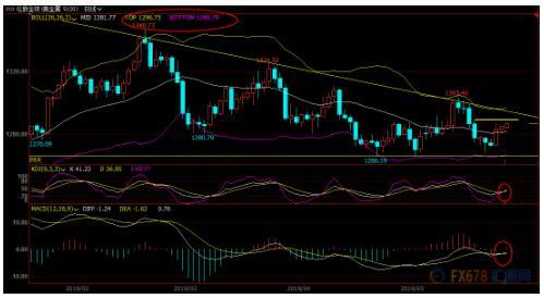 若未能进一步上破1296.74附近阻力,则后市金价仍有重回跌势的风险;而且金价目前还受到5月17日高点1288.93附近阻力压制,若金价直接回落至1280下方(上一交易日低点和5日均线都在附近),则增加短线下行风险。