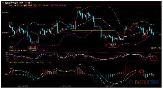 不过,目前各指标信号相对模糊,布林线水平运行,本交易日下破布林线下轨的可能性还比较小;另外,KDJ依然金叉,若意外顶破隔夜改到1285.80附近阻力,增加短线看涨信号。