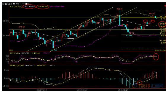 日线级别:震荡上涨;MACD和KDJ的死叉被破坏,汇价收复98整数关口,在失守5日均线97.92前,短线偏向进一步试探前期高点98.37附近阻力;如果上破该阻力,则有望打开新的上涨空间;进一步阻力分别在98.54和98.79附近。