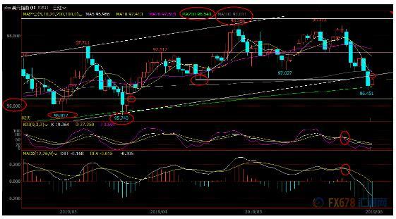 日线级别:震荡下跌;短期均线空头排列,MACD和KDJ死叉运行,汇价下破了1月份以来的上涨通道,后市偏向下行,继续关注200日均线96.54附近支撑,若失守该位置,则可能会进一步跌向3月份低点95.74附近;另外3月22日低点96.20和96.00整数关口附近也还分别存在一些支撑。