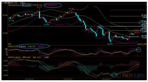 下方留意5日均线96.92附近支撑,若失守该位置,则削弱短线看涨信号;200日均线支撑目前在96.58附近,若意外失守该位置,则增加下行风险。