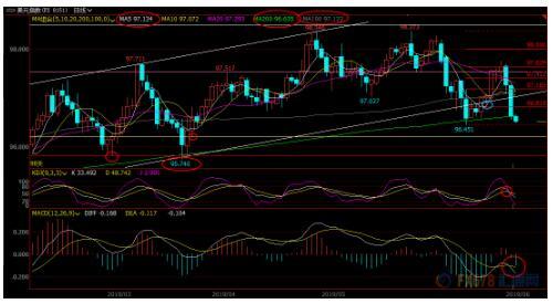 不过,96.45附近支撑也比较强,短线也需要提防小幅反弹的可能性,200日均线96.64位置已经转化为初步阻力所在,6月13日低点96.87是较强的阻力所在,100日均线阻力在97.12附近,若意外收复该位置,则削弱短线看空信号。