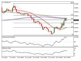 澳元/美元触及0.7021-0.6831跌势的50%回档位,4小时图显示风险偏上行,价格远高于看涨的20SMA上方,技术指标持稳于日高附近,接近超买区域。100和200SMA和日高重合,强化了0.6930区域的阻力力度。
