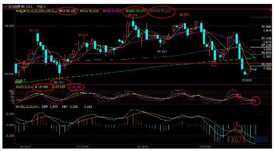 4小时级别:低位震荡;布林线收口,MACD金叉,KDJ死叉,短线走势变数较大,留意布林线轨道95.92-96.39区域突破情况,有望给后市进一步走势提供指引。