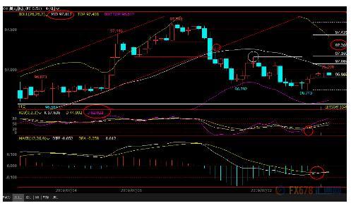 上方5日均线阻力目前在96.98附近,100日均线阻力目前在97.15附近,若意外顶破该阻力,则削弱短线看空信号。
