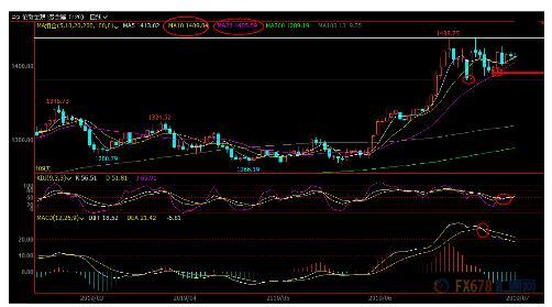 日线级别:高位震荡;MACD死叉,KDJ金叉,布林线轨道延续向上倾斜,均线偏向多头排列,20日均线支撑良好,后市偏向震荡上攻,初步阻力在隔夜高点1419.79附近,然后上周高点阻力在1426.88附近,若顶破该阻力,则有望重新试探前期高点1438.75附近阻力。