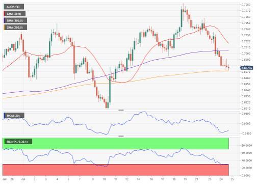 澳元/美元连续4个交易日收跌,短线超卖。澳元/美元未出现下行耗尽的信号,4小时图显示技术指标处在超卖,维持下行倾向。4小时图显示澳元/美元维持在20和100SMA下方,处在200SMA紧上方。若澳元/美元跌破该水平,将触发卖盘。6月未,澳元/美元在0.6950附近获得支撑,若澳元/美元跌破该水平,则汇价将延续下跌。
