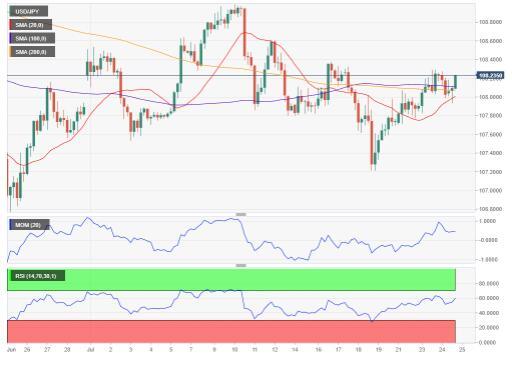 美元/日元维持在7月降势的50%回档上方,同时处在4小时图100和200SMA附近,技术指标方向不明朗。同一降势的61.8%斐波位仍构成阻力,同时受阻于108.40区域,美元/日元上周在该水平处见顶。美元/日元技术指标维持在正区域,自中线温和反弹,方向不明朗。美元/日元短线呈中性,若突破上述阻力则看涨,若汇价跌破107.90则多头势力将减弱。