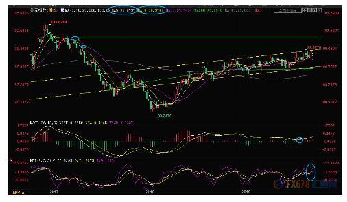 周线级别:震荡上涨;KDJ向上发散,MACD轻微金叉,均线多头排列,后市偏向震荡上攻,目前汇价正逼近上涨通道上轨和前期高点99.38附近阻力,若顶破该阻力,则有望加速涨势,进一步阻力分别在99.89和101.35附近,分别是2017年5月份高点和4月份高点。