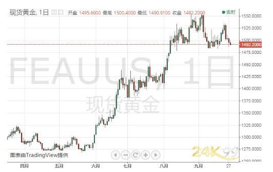 周一亚市盘中,现货黄金继续承压,最低一度触及1490.71美元/盎司。