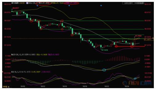 4小时级别:低位震荡;KDJ再次结成金叉,MACD金叉信号延续,布林线 轻微开口,短线汇价偏向沿布林线上轨向上运行,初步阻力在97.89附近,进一步阻力在98.20附近,强阻力在98.60附近。