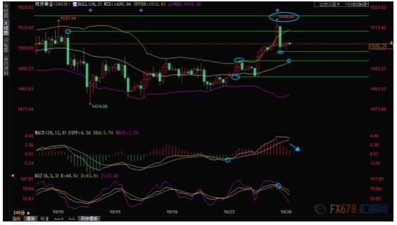 4小时级别:震荡上涨受阻;金价在多重阻力位受阻,1520关口、1557-1459跌势的38.2%回撤位,10月3日高点、10月10日高点,都距离1518.02相去不远;K线在强阻力位附近录得“吞没”看空信号,KDJ死叉,后市存在进一步下行风险;留意布林线中轨1495.94附近支撑,若下破该支撑,则增加后市看空信号。