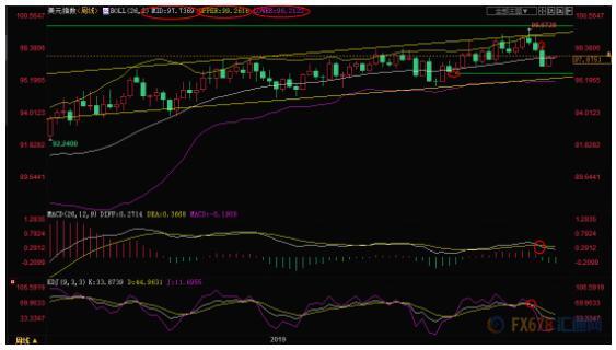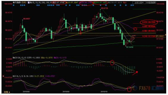 周线级别:震荡;汇价连跌三周后展开反弹,回升至布林线中轨上方,增加了后市变数,若能10月18日当周高点98.65上方,则增加后市看涨信号。