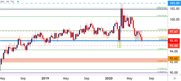 正如上文所提及的,美元指数出现一次例外即日线收盘价曾一度收于关键支撑区间的下方,那时市场处于相当悲观的时期。最初,随着新冠病毒开始被计价,债券收益率下跌,股票遭遇抛售,美元指数开始下跌,这个行情从2月底开始持续至3月初。3月9日(周一),美元在开盘不久后便急剧下跌、很快刷新年内低点至95.00关口下方。