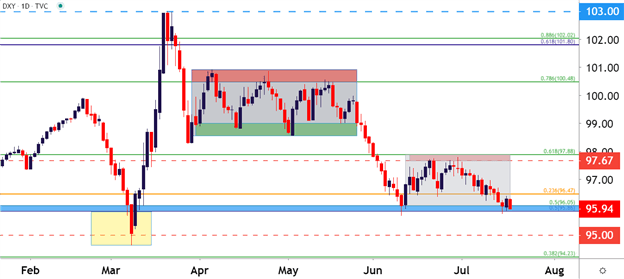 从周线图上看,美元指数的关键支撑区间95.86-96.05(下图蓝色部分)自去年早些的时候变开始,每周收盘时都帮助保持了低位。只有一次例外,那便是今年3月份的时候。
