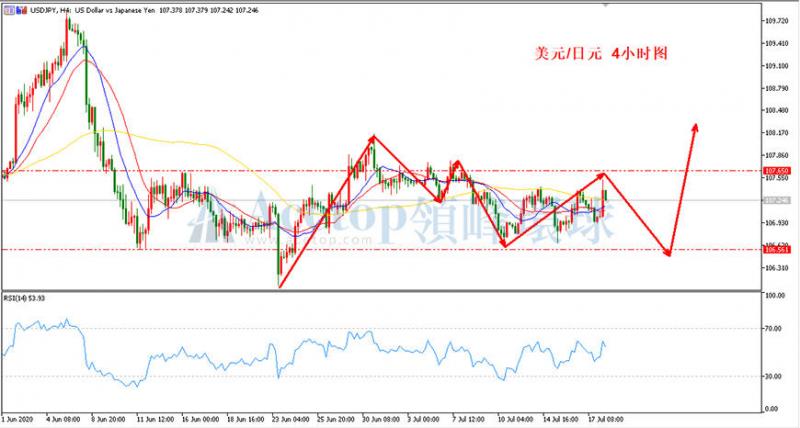 如上图所示,在美日4小时周期中,价格在107.50至106.60区域震荡已有一周时间,在无重要消息情况下预期日内仍在此区域震荡。均线指标上,当前价格位于MA13均线和MA21均线上方,不过需要注意的是MA13均线、MA21均线和MA72均线相互交织,并无方向可言。指标中建议可观察RSI的变化,可等待价格接近于超买或超卖时再考虑操作。参考阻力107.50,参考支撑106.60。