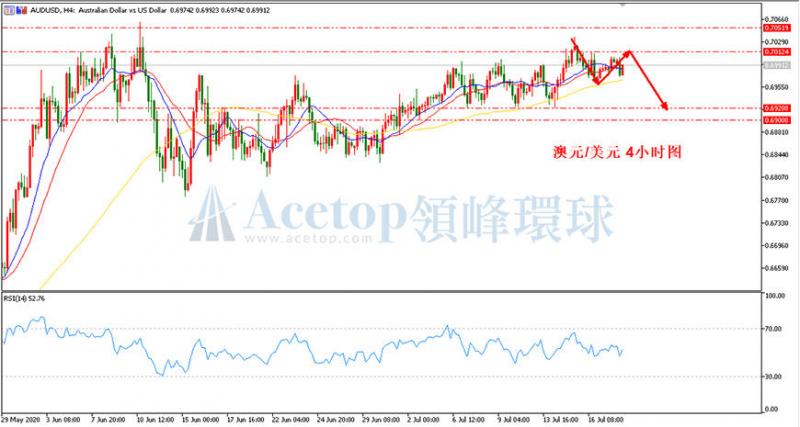 如上图所示,在澳美4小时周期中,MA13均线和MA21均线相互交织,价格也围绕着两条均线震荡,而价格每次回踩MA72均线都得到支撑而上涨,建议投资者日内短期可以以MA72均线作为方向和跟单依据,价格在MA72均线上方,保持多头思路,若价格下穿MA72均线,则反手跟空。趋势上,关注0.6950,跌破0.6950澳美将有机会转为短期的下跌,相反,在当前没跌破0.6950前,澳美仍震荡看涨。参考支撑0.6950,参考阻力0.7051。