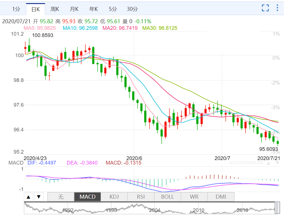 7月20日,美元指数收盘下跌0.23%,报95.80,盘中最低触及95.73,最高触及96.19。不过,对欧洲和美国将出台更多刺激措施的预期,仍限制了美元的涨幅。