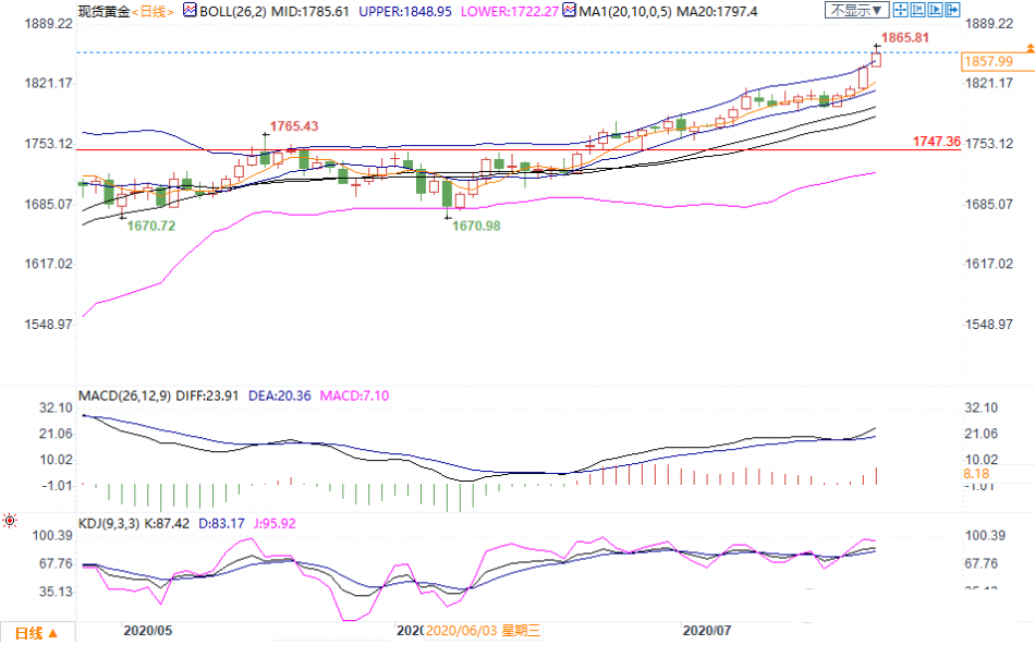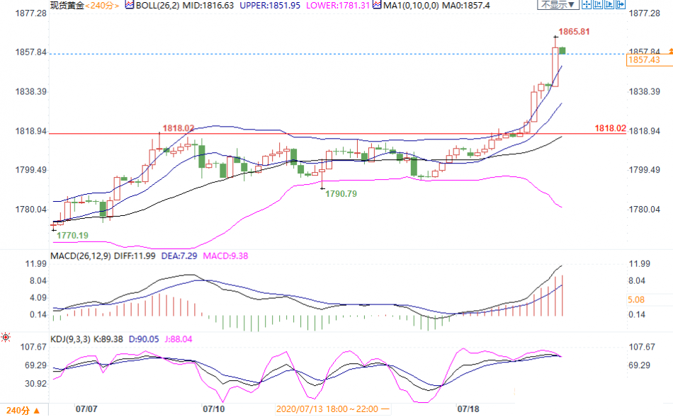 随着金价大幅拉升至1850美元上方,短线上方无明显阻力,后续料上攻1900关口,甚至是2011年9月触及的1921.18。而在此前,可以先简单留意日内高点1865.81以及2011年9月初1884.88附近。