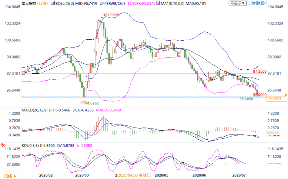 若美元于95.00关口受到支撑,那预计短线会有一波反弹需求。上方初步阻力在6月10日低点95.70及10日均线96.00附近,进一步阻力上看布林带中轨96.74附近;强阻力在6月30日高点97.80,而7月2日高点97.35也有一定压制性。