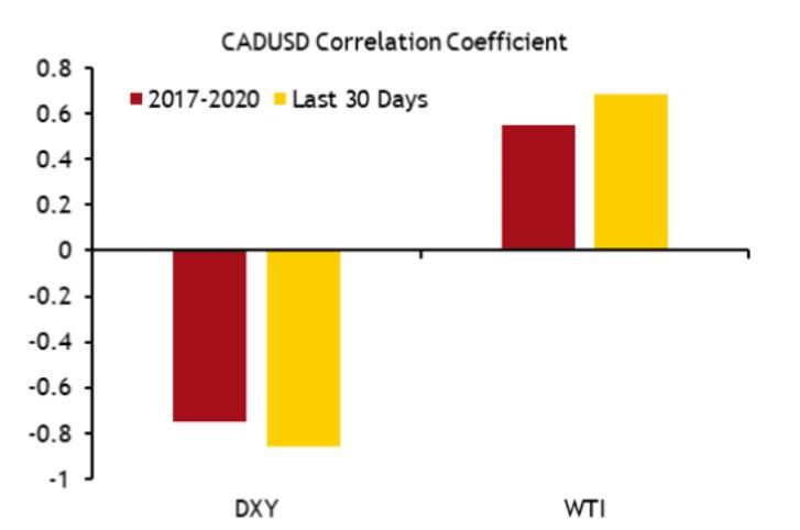 不过,此前因美元指数走软和WTI价格反弹,加元也出现一定程度的反弹。下图显示了加元兑美元和这两个指标的相关性,其中红色柱代表2017-2020年的情况,红色柱代表最近30天,从中可以看到近期的相关性有所增强。