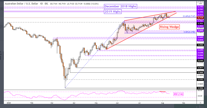 从技术角度上看,澳元/美元或面临反转下行的风险,目前价格正在看跌的上升楔形的支撑线附近承压。倘若后续确认澳元/美元跌破上升楔形形态的支撑线,则可能进一步跌向区间0.7064-0.7015,若破则下一重要的区间关注0.6840-0.6780。
