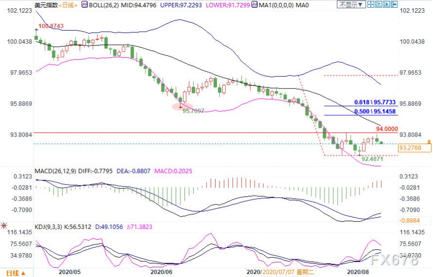 上行方面,初步阻力看向8月3日高点94.00关口,进一步阻力上看布林带中轨94.47。若进一步走高,强阻力关注6月10日低点95.70,这与97.80-92.48这波跌势的61.8%回撤位相近。此外,50%回撤位95.15也需简单留意。