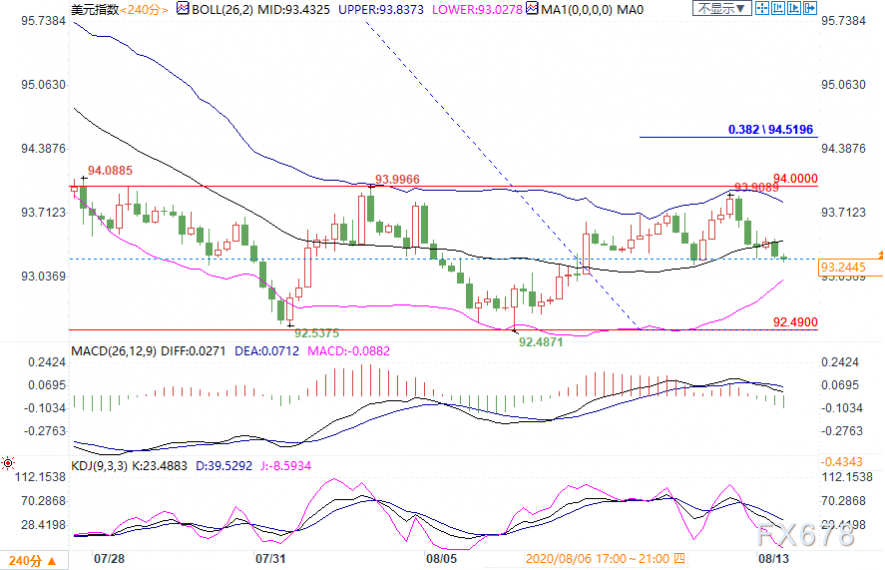 解析:美元走软,盘中一度刷新两个交易日低点至93.20,由于外界对美国共和党与民主党就新一轮经济刺激方案达成妥协的希望消退。美元受到美债收益率下跌拖累,但这可能只是暂时的阻力,美元需要刺激方案相关的积极消息才能进一步走高。