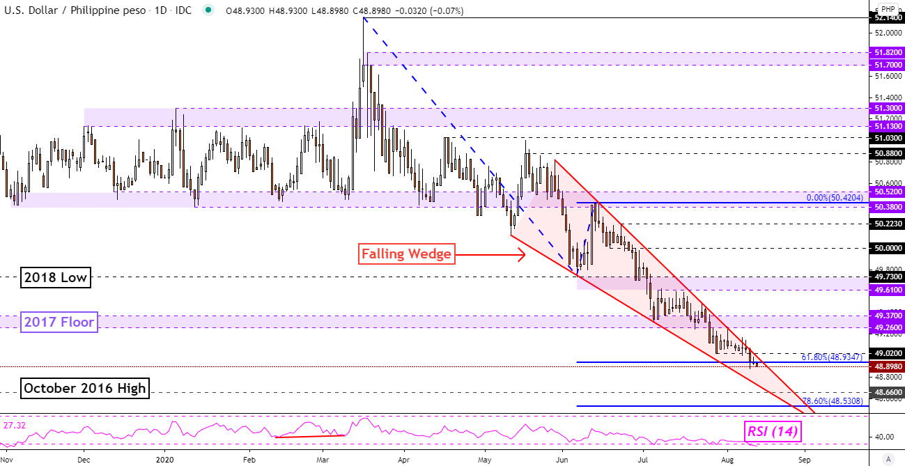 虽然菲律宾比索兑美元继续走高,但美元/菲律宾比索仍交投在下降楔形看涨形态之中。日图显示,汇价目前正尝试确保收于61.8%斐波延展下方,一旦确认将为测试2016年高点开启大门。另一方面,日内若收于下降楔形上轨,就可能逆转自3月以来的整体跌势。