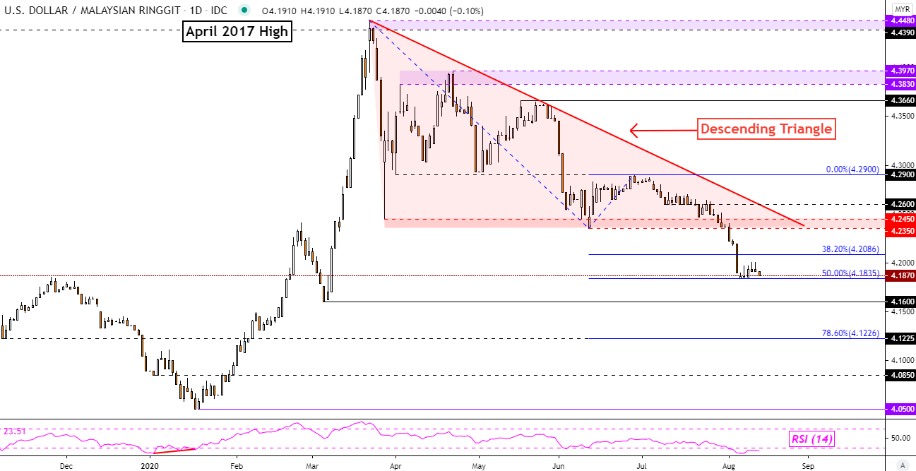 美元/马来西亚令吉下破下降三角形之后,马来西亚令吉兑美元最近一直在盘整。下降三角形是一种典型的持续形态,最终可能为汇价延续从3月高点跌向年低的趋势铺平道路。日内若收于50%斐波延展4.1835下方,则看向3月低点4.1600;反之,初步阻力位于38.2%斐波延展4.2086。