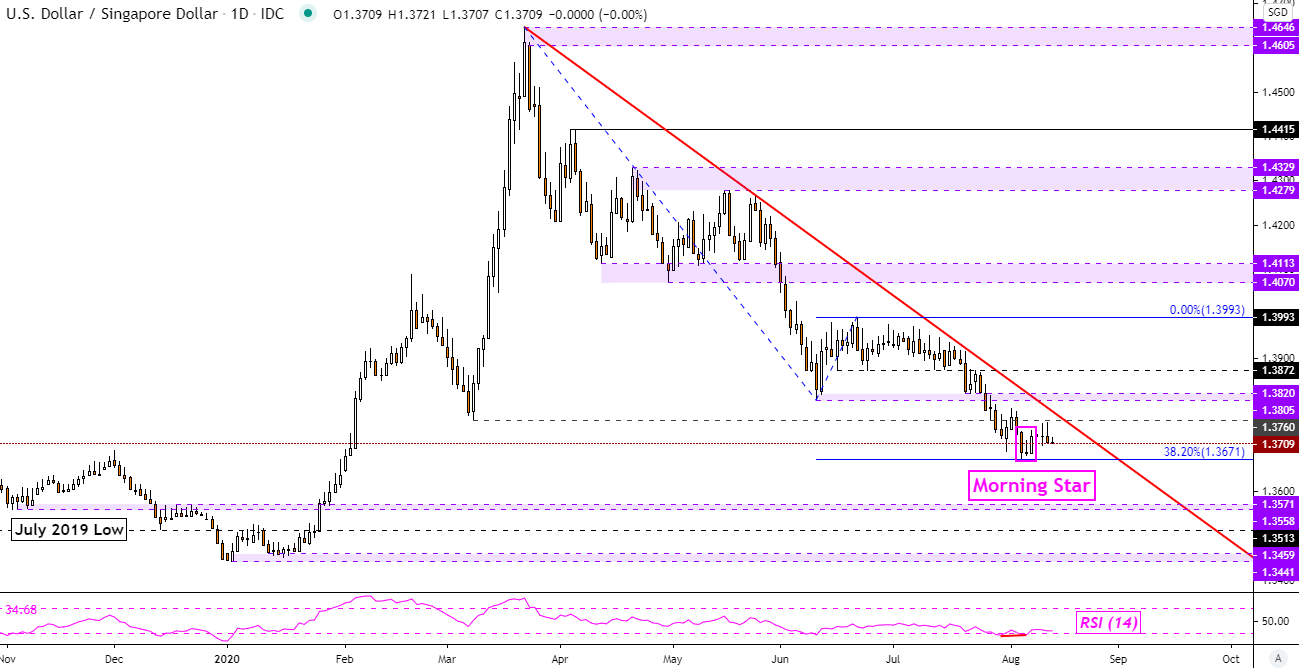 美元兑新加坡币或正为反转走高做好准备。美元/新加坡币日图上最近形成了一个早晨之星看涨形态。不过,由于汇价难以站上3月低点1.3760,上行趋势在某种程度上还缺乏确认。另外,始于2020年高点的关键阻力线(红色)或仍为整体趋势。日内若收于38.2%斐波延展1.3671下方,则为测试前阻力1.3558-1.3571区域敞开大门。