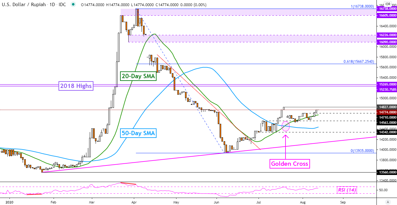 美元兑印尼盾似乎正重回攻势。美元/印尼盾难以收于20日SMA(简单移动均线)下方。另外,日图上20日SMA上穿50日SMA,形成金叉看涨形态后,汇价似乎正在上涨。日内若收于14827上方,就为恢复自6月以来的反弹开启大门,上方目标看向2018年高点;反之,若反转下行,则需关注14563(50日SMA切入位)。