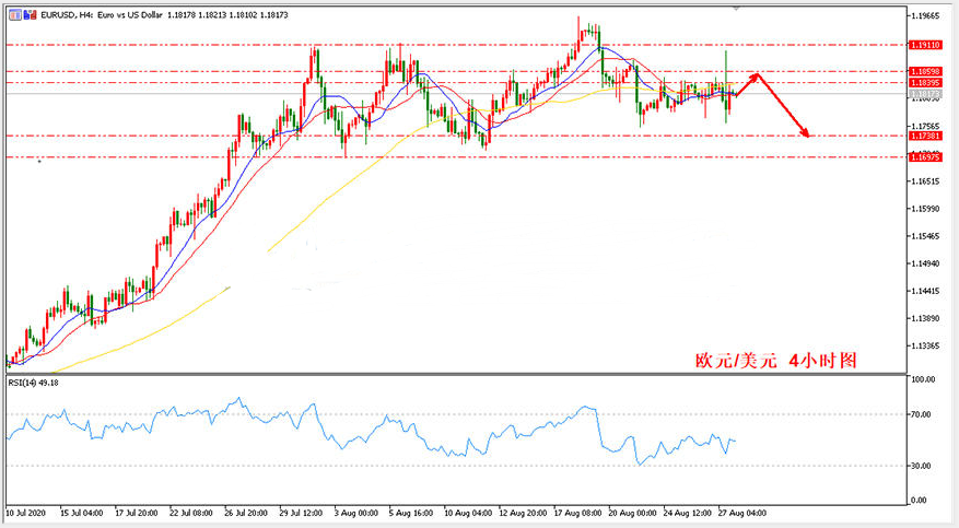 在欧美4小时周期中,以目前高点1.1964为起点的下跌趋势目前仍在保持,节奏阻力1.1911,反弹不突破1.1911趋势将延续下跌,破前期低点只是时间问题,从趋势的角度判断,短期内将有望下跌至1.1738-1.1697区间。故而,反弹做空仍是当前主思路。指标上,所有均线依然相互交织,均线指标处于无趋势状态中,可关注RSI指标的变化,若指标出现在超买区,参考如下阻力尝试布局空单。参考阻力1.1839、1.1869;参考支撑1.1738、1.1697。
