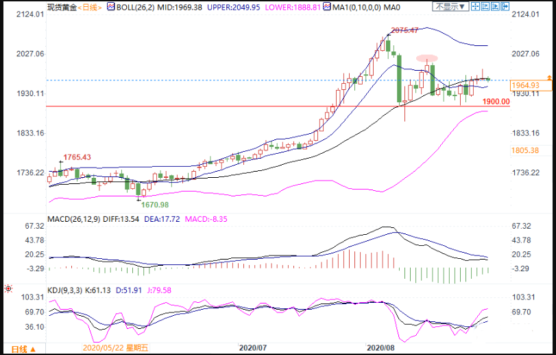 上行方面,先上看前一交易日高点1992.48;进一步阻力位上看8月18日高点2015.59。若金价继续冲高,有望重新测试布林带上轨2050.00,甚至可能再度测试纪录高点2075.47。