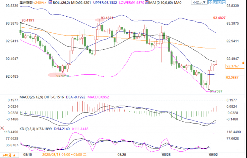 上行方面,初步阻力先留意布林带中轨93.00关口。强阻力始终上看8月3日高点94.00关口,该关口自7月末来被多次测试。一旦该关口被上破料终结通道下行格局,进一步上看97.80-91.74这波跌势50%回撤位94.77。